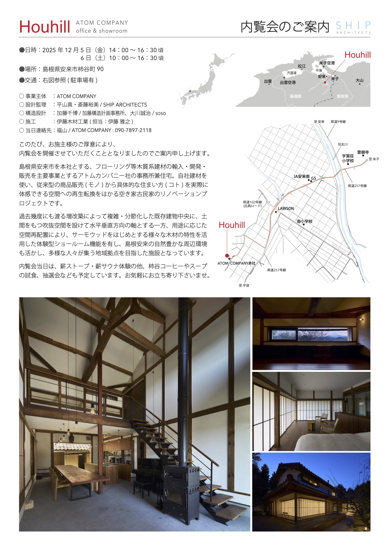 25.12.25 「Houhill(ハーヒル)」の内覧会を開催いたします。日時:12月5日(金) 14:00〜16:30頃。12月6日(土) 10:00〜16:30頃。詳細はこちらをご確認ください